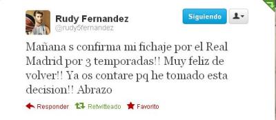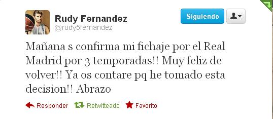 Sin embargo Rudy no ha querido esperar más y en su cuenta personal de twitter confirmaba su vuelta al Madrid con este tweet: «Mañana se confirma mi fichaje por el Real Madrid por 3 temporadas!! Muy feliz de volver!! Ya os contare pq he tomado esta decision!! Abrazo».