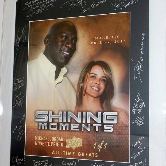 La prestigiosa marca de cromos estadounidense Upper Deck, ha querido conmemorar el enlace matrimonial entre Michael Jordan e Yvette Prieto y para ello ha sacado una felicitación a tamaño gigante en la que se puede apreciar una foto de la pareja en el centro, mientras que un marco exterior negro se utiliza para las firmas, muchas de las cuales están inscritas con notas personales. Los firmantes del regalo tan especial son: Ahmad Rashad, Brandi Chastain, Brett Hull, Chris Chelios, Dwight Freeney, Flex Alexander, Julius Erving, Ken Griffey Jr. , Mario Lemieux, Richard Dent, Ron Harper, Salli Richardson, Toni Kukoc, Vince Coleman , Wayne Gretzky y Winn McMurry.