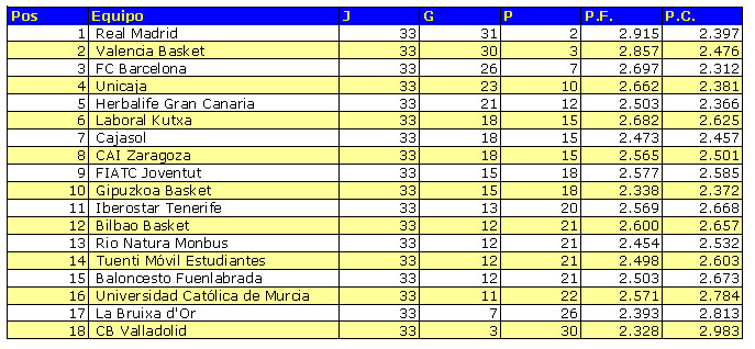 Trigesimo tercera y penúltima jornada de la Liga Endesa, la disputada entre el fin de semana y este martes, ya con pocas cosas en juego para la mayoría de los equipos, pero que ha servido para resolver la duda sobre las últimas plazas de playoffs por el título que quedaban por cubrir en los duelos directos entre los aspirantes a ocuparlas.