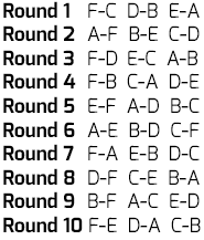 Los equipos de cad grupo jugarán una liguilla a doble enfrentamiento todos contra todos, completando un total de 10 partidos. Para determinar el calendario de enfrentamientos, los equipos dentro de su grupo recibirán una letra de la A a la F y los partidos se jugarán según el siguiente esquema: