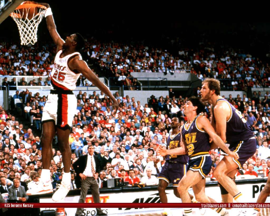 Sea como fuera, nos deja uno de los jugadores más recordados de la franquicia de Oregón. Formado en Longwood Gollege, fue elegido por los Blazers en segunda ronda del draft de 1984, en el puesto cuadragésimo sexto. Alero de 2,01 y 98 kilos, Jerome Kersey era el jugador que aportaba el equilibrio en defensa en un equipo por el que pasaron algunos de los mejores jugadores de ataque de los 80, como Terry Porter, Clyde Drexler o Kiki Vandeweghe. Siempre un seguro en la pista, a partir de la temporada 87/88 se convirtió en titular indiscutible y promedió en casi todas sus temporadas en Portland alrededor de 15 puntos, 8 rebotes y 3 asistencias.