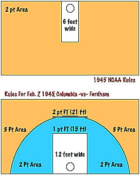 Esta fue la primera vez que se probó la línea de tres en un partido de baloncesto, pero extrañamente, la idea se abandonó hasta muchos años después. No fue la única variación del reglamento que se ensayó ese día y así, junto a la línea de tres puntos situada a 21 pies del aro (6,4 metros), se ensanchó la zona de los 6 pies que medía entonces a los 12 habituales (de 1,83 metros a 3,66) y se ofreció a los jugadores la posibilidad de lanzar los tiros libres desde la línea habitual a los 15 pies o 4,60 metros que conocemos o desde la línea de tres puntos. Desde los 4,60 el tiro libre valía un punto y desde la línea de tres valía dos puntos. Columbia usaría esta posibilidad para encestar 3 tiros libres por 5 de Fordham.