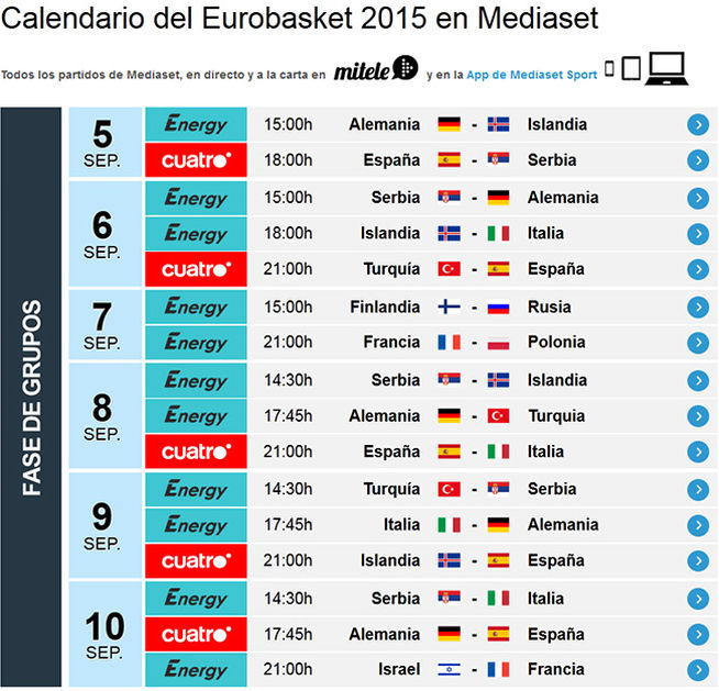 Bien, este es el calendario de retransmisiones. Como el Eurobasket, obviamente no se compone sólo de estos emparejamientos, les mostramos a continuación el resto de partidos que se celebrarán cada día:
